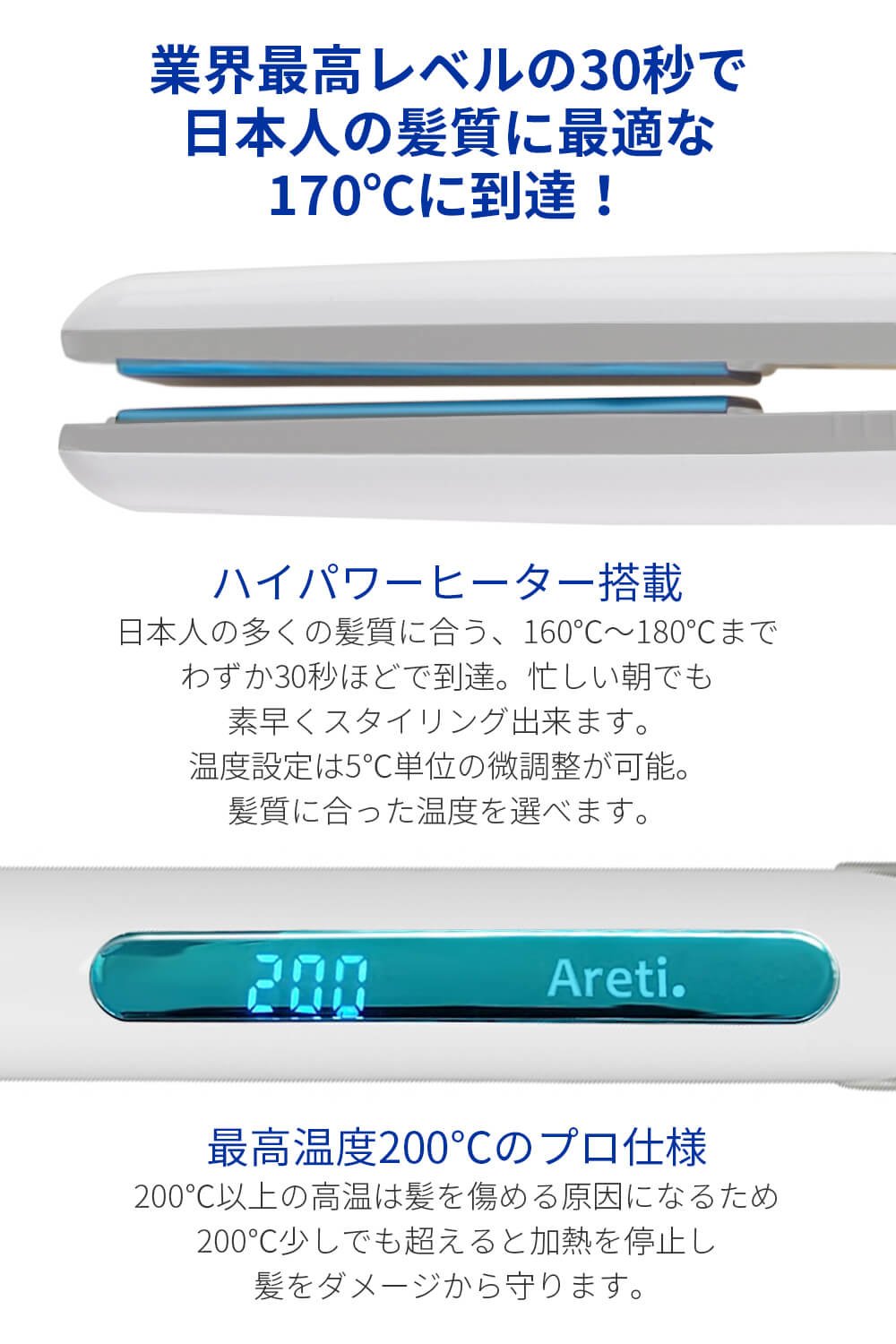 わずか30秒で170℃に到達!忙しい朝にも便利なハイパワーヒーター搭載。最高温度は200℃。