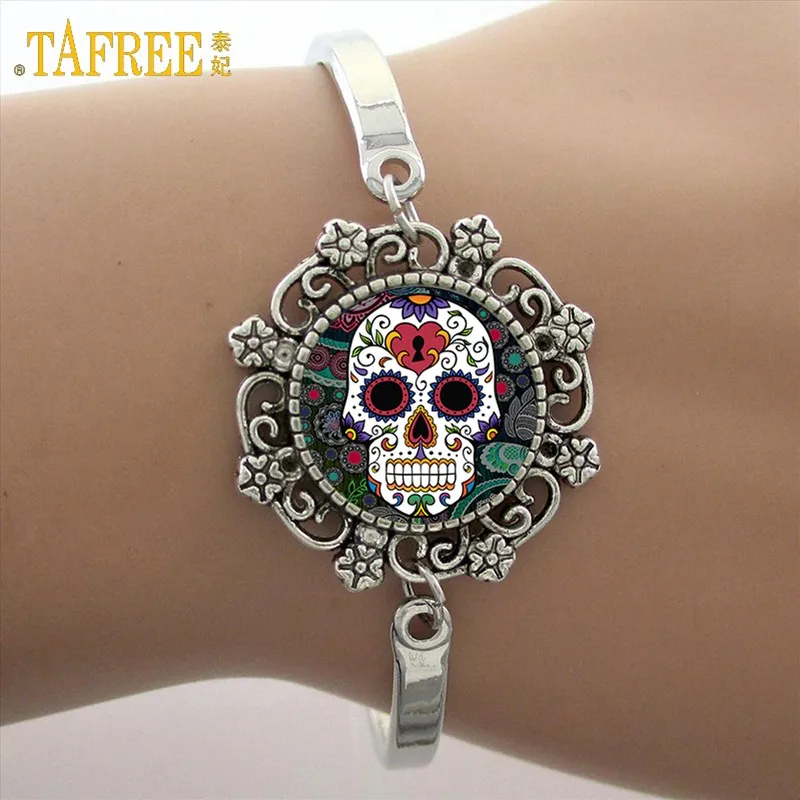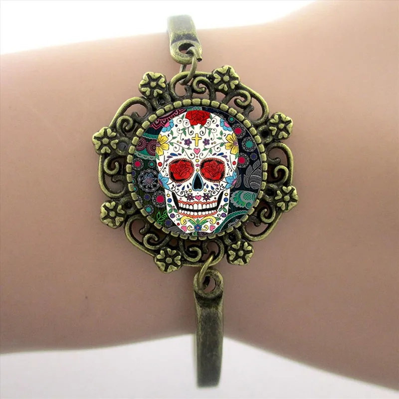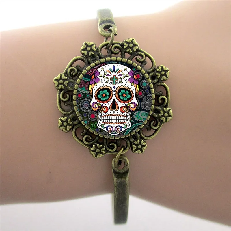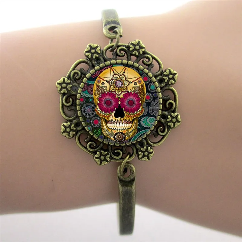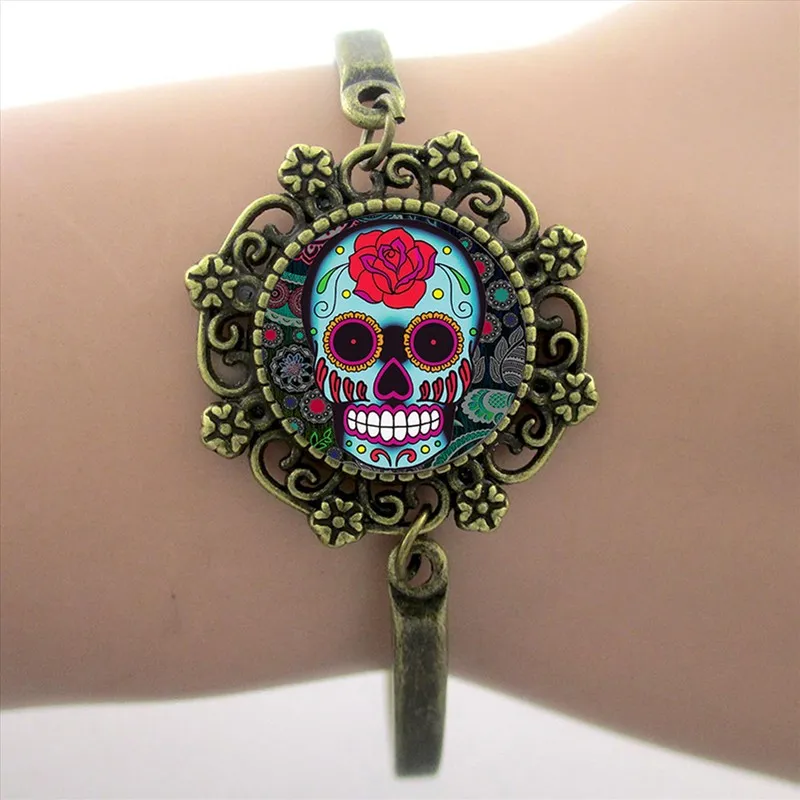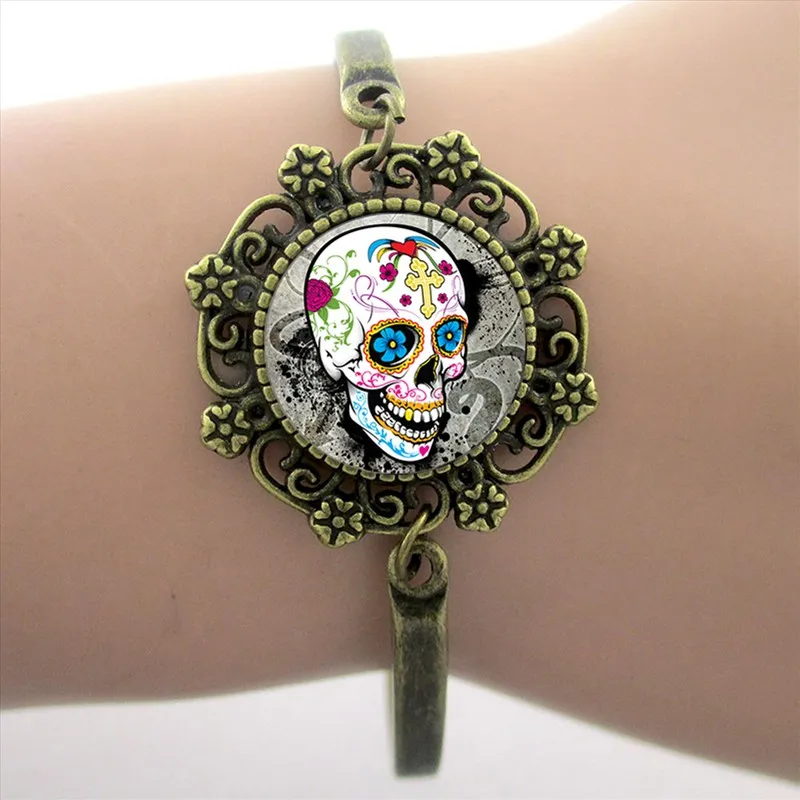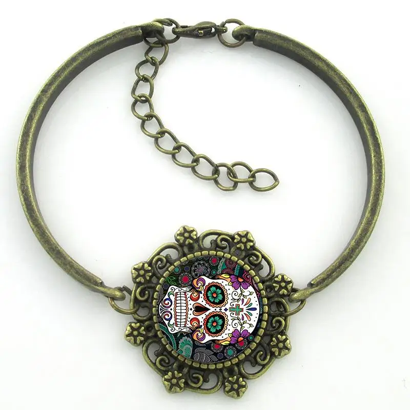Description:Sugar Skull Charm Glass Dome Bracelets