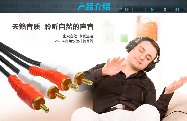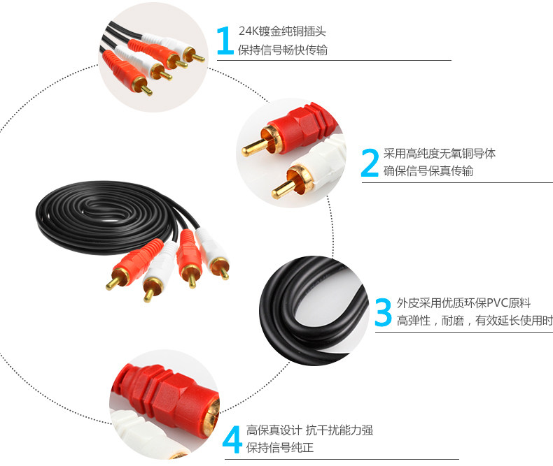 达而稳二对二音频双莲花线采用高纯度无氧铜线芯,进口端子、优质PVC塑胶等材料制造,线身柔软、弯曲性好,采用高屏蔽保真设计,抗干扰性能强,传输信号效果好,使用效果佳,天籁之音,让您有着不同的体验。