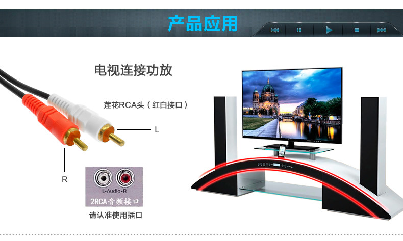 【产品用途】通过此线,可以将DVD或电脑灯播放设备上的音频信号输出到音箱上