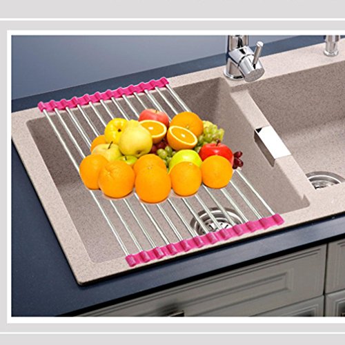-. Feature : Material: PVC+stainless steel / Color: green,hot pink / Environmental silicon material on both ends, non-slip and used safety / This unique stainless steel drying rack rolls out to fit neatly over your standard sized kitchen sink / Package included:1 x sink rack (rack only)