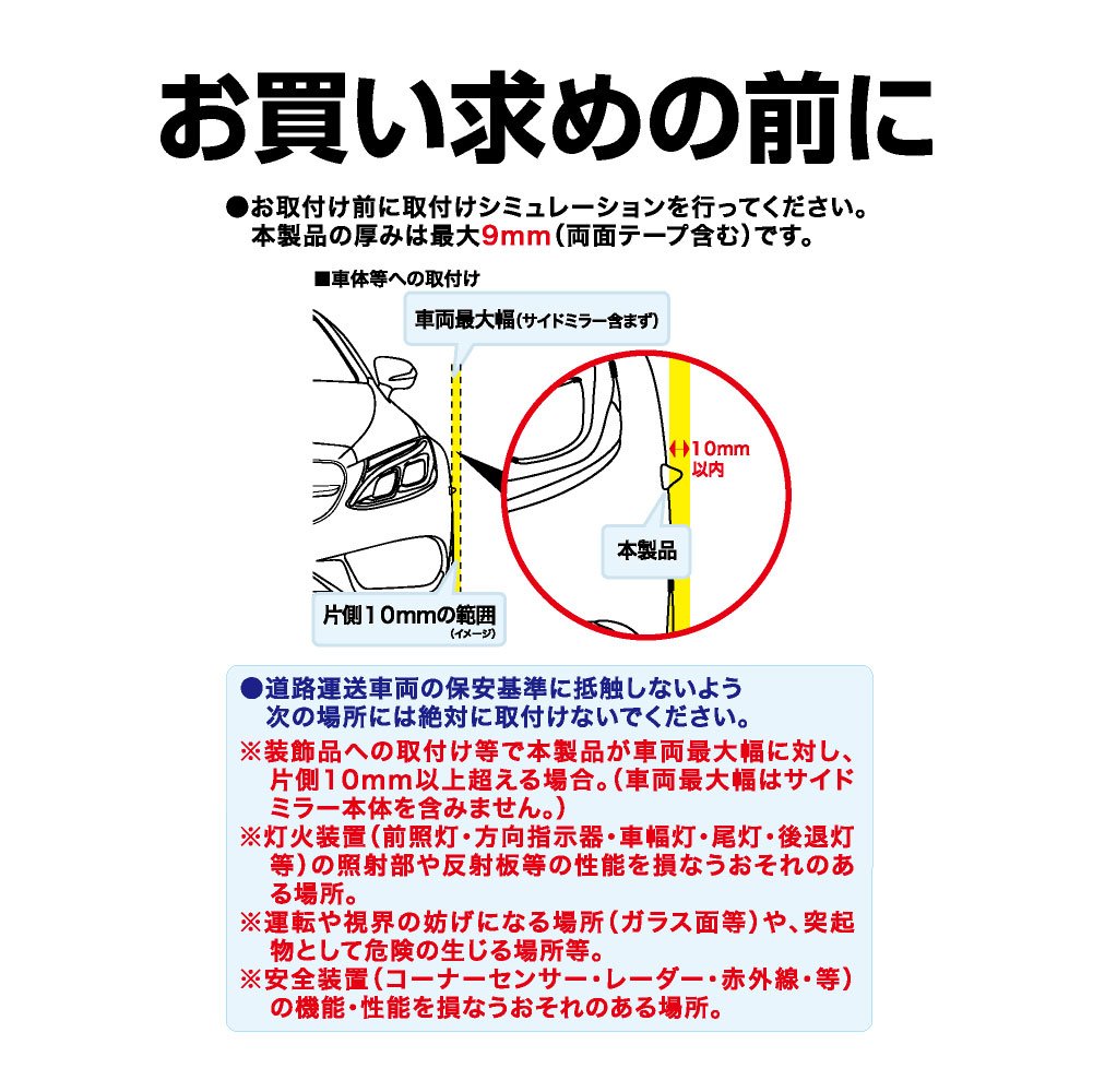 * When this product exceeds 10 mm on one side with respect to the maximum width of the vehicle due to installation on accessories etc.