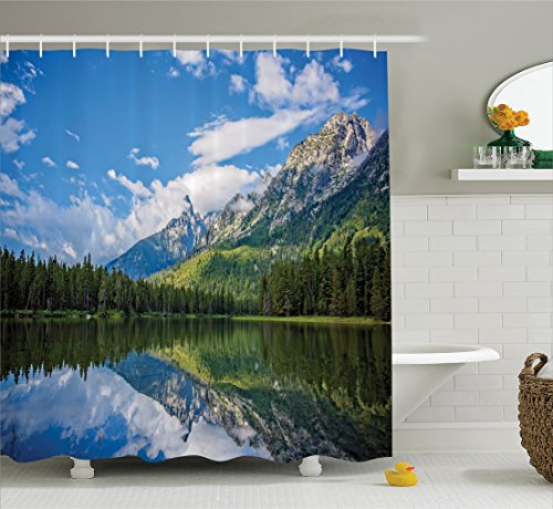 Lake House Decor Shower Curtain Set By Ambesonne, Pure Mountain Lake Scenery With Trees And Bright Cloudy Sky Nature Look Print, Bathroom Accessories, 69W X 70L Inches, Blue White Green