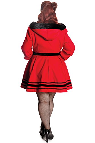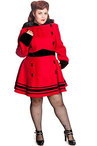 Binding : Apparel Product Description New Color from Hell Bunny Winter Coat Collections. Simply pretty red hooded winter coat in a stunning high quality red poly blend fabric. Fully lined in red satin effect polyester, this coat is sure to keep you cute and warm this winter, featuring double front button detailing (fastening to one side), and thick faux-fur trim to the hood. Complete with black velvet trim to the cuffs, midsection and hem, plus two waist pockets with velvet edging decorative buttons. Finished beautifully with an ornate black braiding trim at the hem!