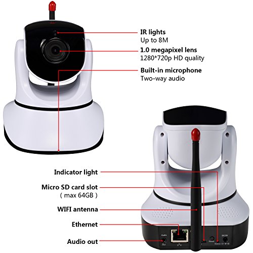 motion detection gives alarm notification to your phone and alarm email with pictures to you. Supports cycled recording on Micro SD Card up to 64GB, auto snapshot.