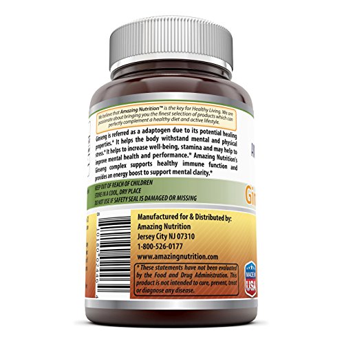 -. Feature : BENEFIT FROM A NATURAL ADAPTOGEN Korean ginseng may help your body withstand the effects of stress! Ginseng extract may also help to supports healthy immune function, supports energy production and boosts mental alertness / MAXIMALLY EFFECTIVE Amazing Nutrition ginseng supplement has a 4:1 concentration, making potent and effective! / AN ALL NATURAL GINSENG SUPPLEMENT SIMPLE TO ADD TO YOUR DIET Our ginseng extract capsules provide a 1000mg dose with just two capsules making it easy to benefit from ginseng. With no artificial preservatives, colors or flavors, our ginseng supplement is the natural choice for your diet / QUALITY All Amazing Nutrition products are manufactured in accordance with Good Manufacturing Practices (GMP), among the highest standards in the world. / PURITY & POTENCY All our products are proudly made in USA with Guaranteed Purity & Potency. We offer best quality products for the best value. All our products are Third Party Tested. We do not compromise on quality.