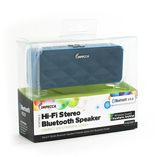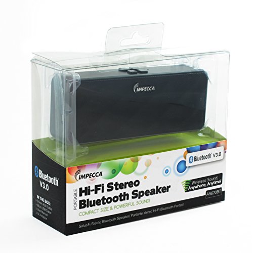 -. Binding : Electronics -. Brand : Impecca -. Feature : New Bluetooth v3.0 Technology allows you to Connect wirelessly up to 32 feet away. (10 meters) Seamlessly stream and share music, movies, games, phone and conference calls anywhere. / Built-in Li-Ion Rechargeable Battery for up to 10 hours of playtime. Built-in microphone for hands-free speaker phone calling / 3.5mm Audio Line In - Don't have Bluetooth? The AS620 allows you to connect the speaker directly to a standard headphone jack. With aux cable (Included) / Premium Sound with Bass Enhance Technology. powerful Speaker delivers crisp clean sound with deep bass / Micro USB charging port, With battery Standby time: Up to 2 months -. Label : Impecca -. Manufacturer : Impecca -. PackageQuantity : 1 -. ProductGroup : Network Media Player -. ProductTypeName : PORTABLE_AUDIO -. Publisher : Impecca -. Studio : Impecca -. Title : Impecca AS620 Portable Wireless Bluetooth Speaker with Built in Speakerphone