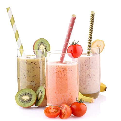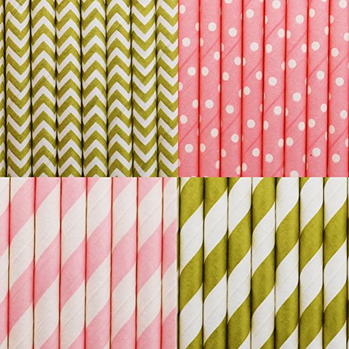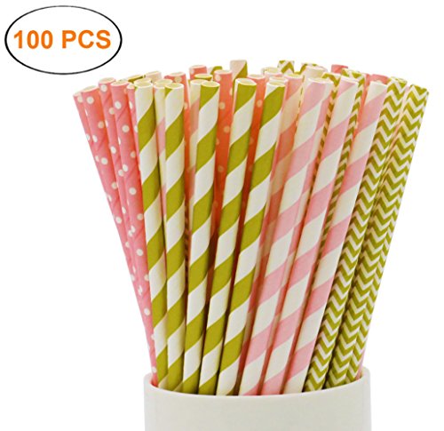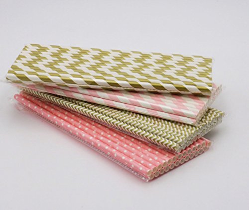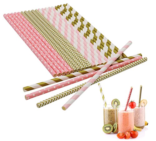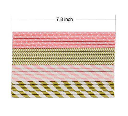 SOOKOO 100 Pack Gold and Pink Stripe, Chevron and Dot Biodegradable Paper Straws for Birthdays, Weddings, Baby Showers, Celebrations and Parties