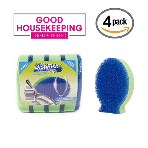 - POWERFUL CLEANING & SUPER ABSORBENCY. The DishFish Dual scrubber sponge offers both powerful non-scratch scrubbing for the kitchen and “single-swipe” cleaning for counters and everyday spills. Clean glasses, pots, greasy pans, sinks and sensitive surfaces with this powerful, dual-action, scrubber sponge. The DishFish cuts through tough messes in warm water and even tougher messes in cold water.