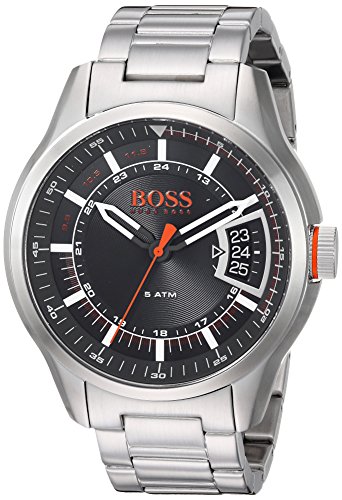 Gents Hugo Boss watch collection. Stainless steel case. Stainless steel link strap. Black dial. Date display. Case size: 46mm. Scratch resistant mineral crystal. Water resistant: 50 meters 165 feet. Movement: Quartz. Comes with original box and booklet. Warranty: Two Years.
