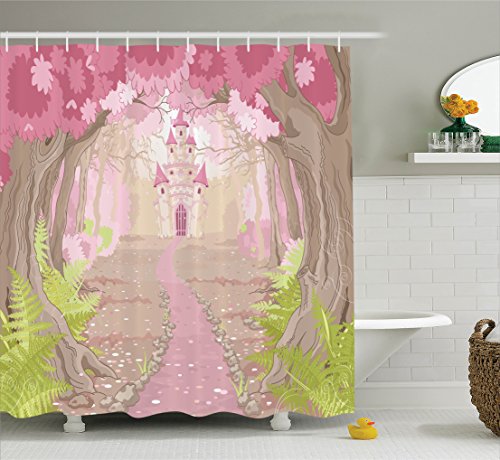 Ambesonne Teen Girls Decor Collection, Path to the Fairy Tale Princess Castle in Fantasy Forest Landscape Artwork Print, Polyester Fabric Bathroom Shower Curtain Set with Hooks, Green Beige Pink