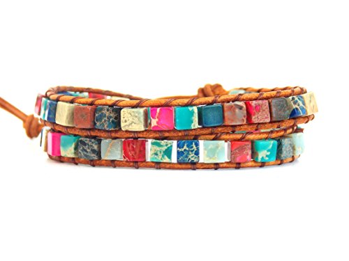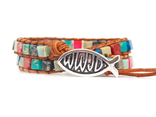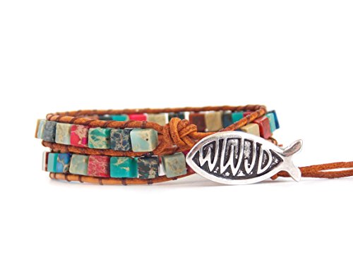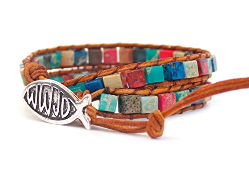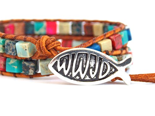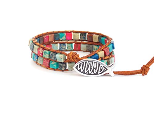 -. Feature : 2 wrap leather bracelet with Jesus Fish Button / Adjustable button loop closure 16" L / Handmade with love, using colorful mix of beads and a petite silver tone button