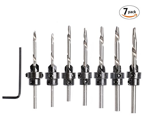 - ✓ SPECS: 7 Countersink 4-Fluted Bits with 7 Hex adjustable Depth Stop Collars, Compatible with Screw Sizes: #5, 6, 7, 8, 9, 10, 12. - Bit sizes: 1/8", 9/64, 5/32, 11/64, 3/16, 13/64, & 7/32 inch - Allen Wrench: 3/32” diameter.