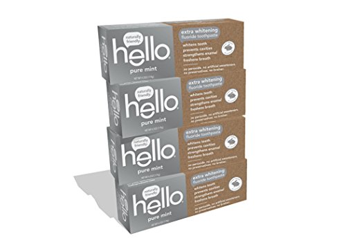 Say hello to naturally friendly extra whitening fluoride pure mint toothpaste. It's thoughtfully formulated with high quality ingredients like xylitol, stevia and a silica calcium carbonate blend that gently whitens teeth. Ever the overachiever, it also tastes awesome, prevents cavities and strengthens enamel. Hello contains no peroxide, no artificial sweeteners, no artificial flavors, no dyes, no preservatives, no microbeads, no triclosan, no parabens, and no gluten and the hits just keep on coming: Hello is also vegan, never tested on animals (Leaping Bunny Certified and PETA recognized) and made in the USA. whitening without peroxide. Brilliant, just like you.