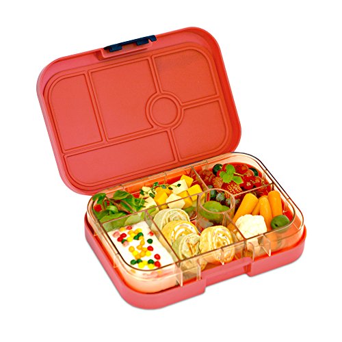 Yumbox is a bento-style, kid-friendly, leakproof food container designed to make health lunch packing a breeze! Ideal for school lunches, camp, picnics, travel, toddler meals, snacks and all of your meals-on-the-go! Help kids establish healthy eating habits by packing balanced meals everyday. Yumbox's illustrated, pre-portioned food tray guides you (and your kids) to packing a healthy balanced meal. Yumbox's food tray is divided into five ½ cup portions of the main food groups: Fruit, Vegetable, Grains, Protein, Dairy. Plus a small treat or dip well too! Yumbox is leakproof! Its silicone molded lid engages with the food tray to create a tight seal. No leaks inside or outside of the box. Pack applesauce next to crackers with no worries! One lid seals all compartments (no lost lids!). A sandwich will fit neatly in two food wells when cut in four pieces. Kid-friendly latch. Yumbox saves you money by eliminating the need for baggies, multiple containers.