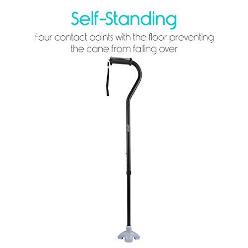 QUAD SELF STANDING DESIGN: Self-standing, the cane tip has four contact points with the floor preventing the cane from falling over. The compact design also works well on stairs.