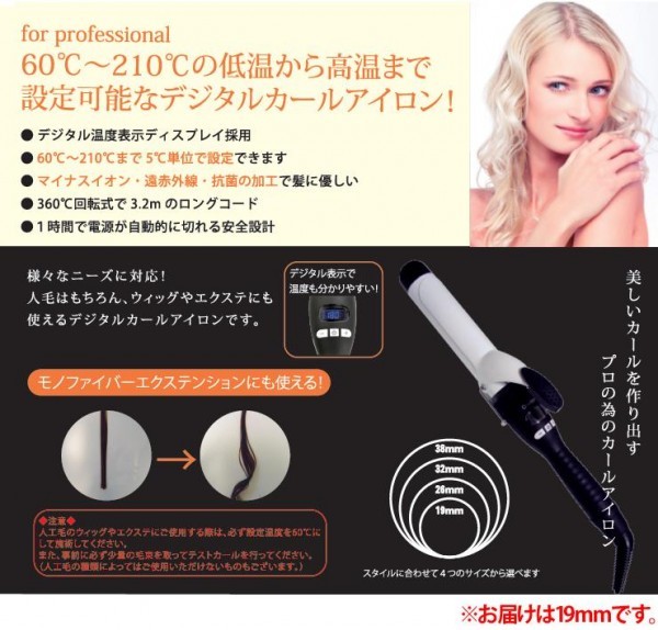 人毛はもちろん、ウィッグやエクステにも使えるカールアイロンです。デジタル温度表示ディスプレイ採用で温度確認ができ、温度調整で髪質に応じた施術が簡単に行えます。マイナスイオンと遠赤外線の効果により、よりつややかなストレートヘアに仕上がります。電源コードは、ねじれに強い360度回転仕様です。1時間で電源が自動的に切れる安全設計。 |
