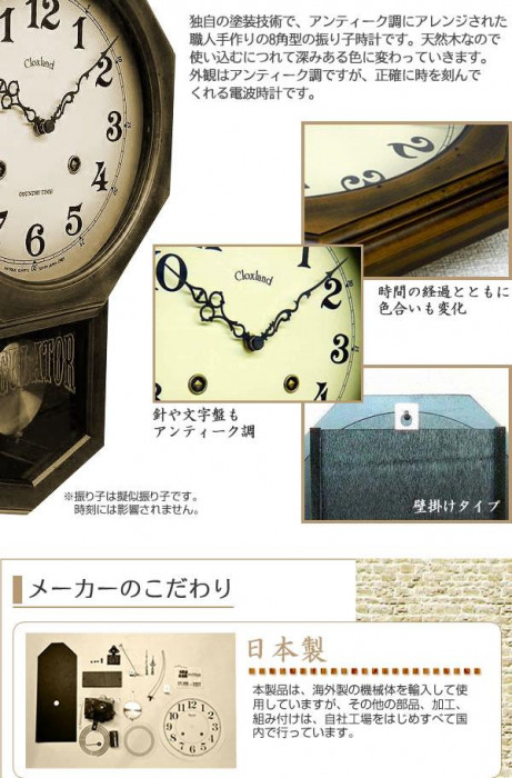 | 独自の塗装技術で、アンティーク調にアレンジされた職人手作りの電波振り子時計です。天然木で作られているので使い込むにつれて深みある色に変わってくのも魅力です。 |