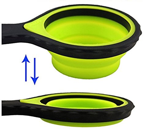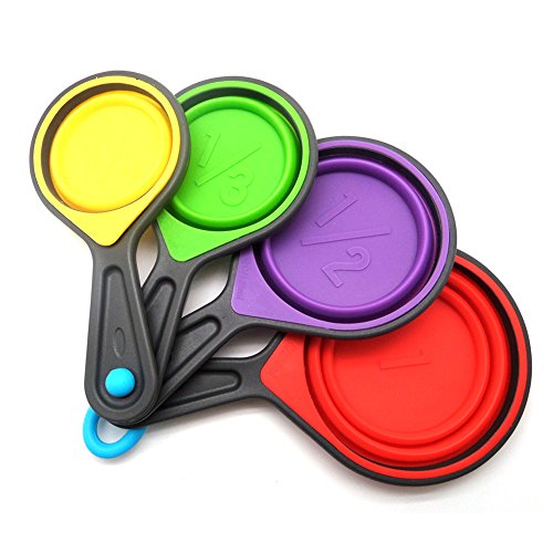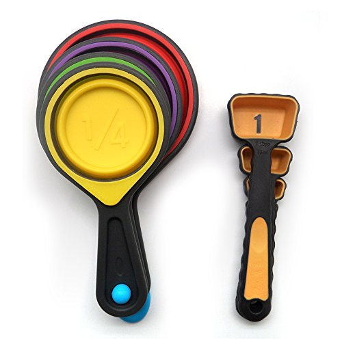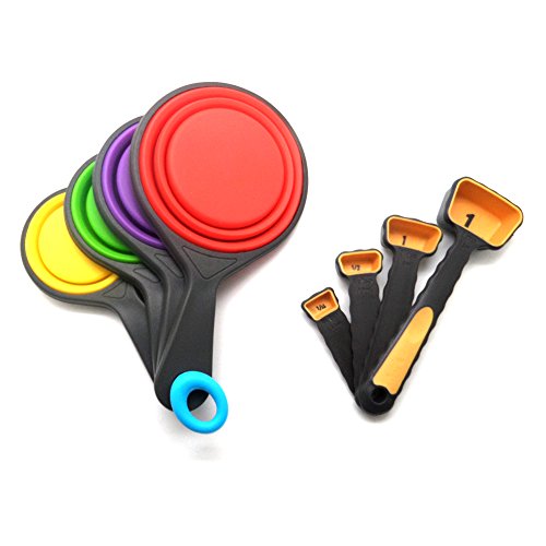 - ☯ 4 Collaspible silicone cups - 1-cup, 1/2-cup, 1/3-cup, 1/4 cup, 4 Measuring spoons - 1/4 Teaspoon, 1/2 teaspoon, 1-teaspoon, 1-tablespoon.