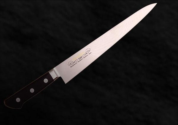 | 錆に強く、切れ味の持続性に優れたオリジナルのステンレス鋼(MBS-26)を使用した高級ステンレス包丁です。手に伝わる重量感はプロの感覚そのままに、実用性を重視した本職用牛刀です。 |