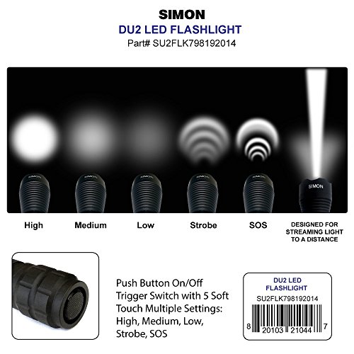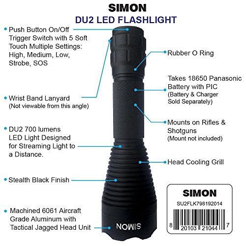 Simon Cree DU2 Brightest LED Tactical Flashlight used by Law Enforcement. This Bright Cree LED Flashlight Torch Streams 700 Lumens for Distance with 5 Modes & Can be Mounted on Standard Tactical Rail