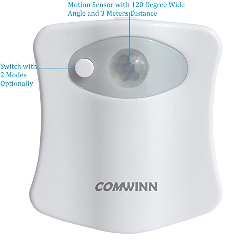 COMWINN LED Sensor Motion Activated Toilet Light Please Note: The 3 xAAA Batteries are Not Included! If Your little year old kid hates being left alone in the toilet and you wanna look for a way to make it less scary, the
