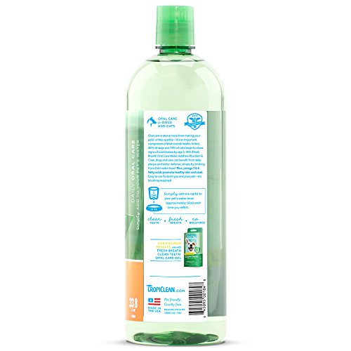 Fresh Breath + Skin & Coat is enriched with Omega 3 & 6 to promote healthy skin and coat. These essential nutrients promote complete pet wellness and daily oral care in one easy-to-use product. Healthy skin and coat + 12 hours of fresh breath! Fresh Breath +Plus is uniquely designed to clean teeth, freshen breath and promote complete pet wellness. Daily oral hygiene is essential to pet health. Without it, 70% of dogs and cats will start showing signs of periodontal disease by age three. When left untreated, oral disease can lead to serious health problems affecting the heart, lungs, kidney and other major organs.Feature