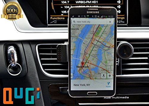EASY MOUNT QuGi® Air Vent Mount Cell Phone Holder. Rotates 360. Holds Most Smartphones Including Galaxy S4 and S5, IPhone 6, iphone 6 plus, IPhone 5, 5S and 5C, LG G2, and Nexus 5. Even Holds Galaxy Note 2 and Note 3. Ipod, Small, Sleek, Simple. Fits in Your Pocket and Doubles as a Desk/table Stand. (Black) - No screwing, clipping, clamping, or other annoying things. Simply Press in place and pull off. Fits almost all vents, even deep semicircle vent louvers that other vent mount systems don't work with. Just squeeze rubber prongs on back to rotate