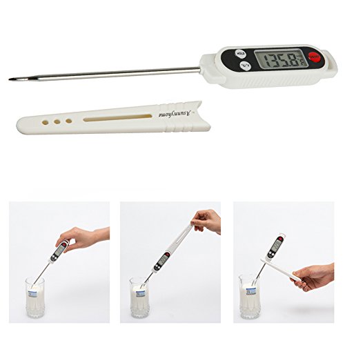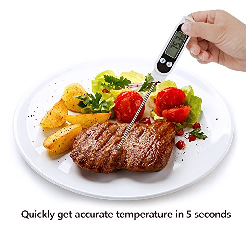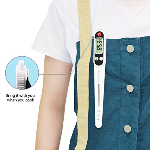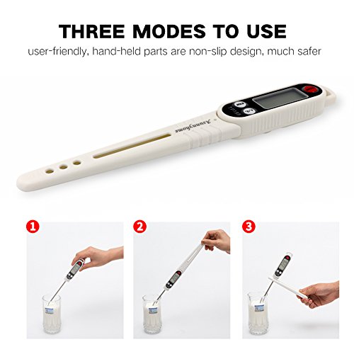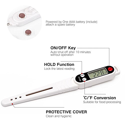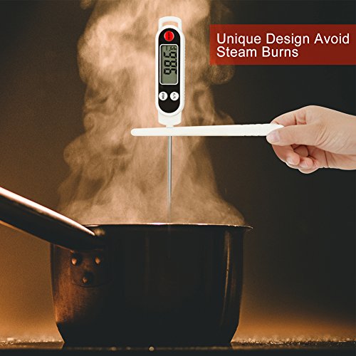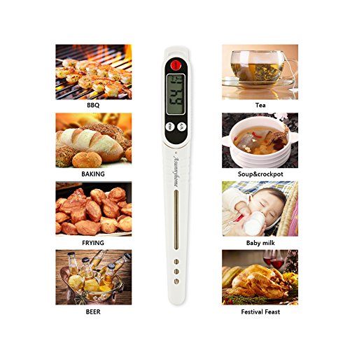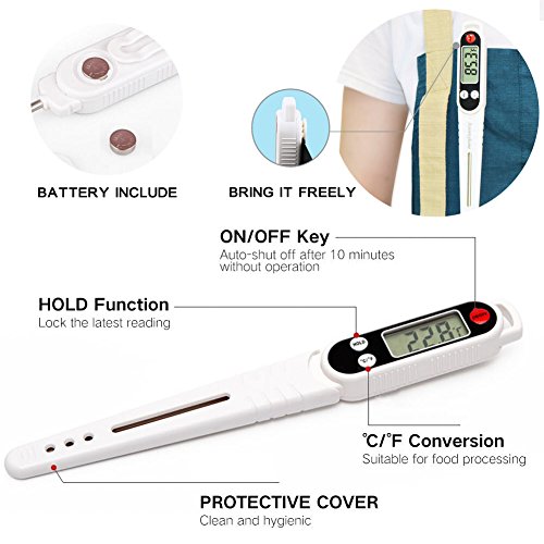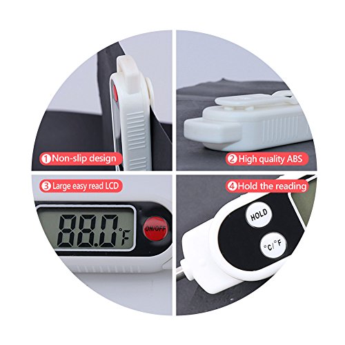 Tips: Perfect temperature for: Baby's milk:37-42℃(98.6℉) Roast meat:Meat center 75℃(167℉) Fried seafood:90℃(194℉) Tea water:80-85℃(176-185℉) Summer beer:6-8℃(42-46℉) ATTENTION: NEVER use the thermometer in the oven! NEVER let the kids get close to it! 0