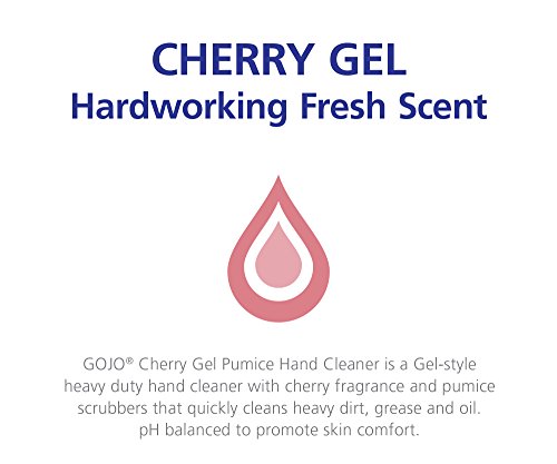 -. Feature : Heavy-duty hand cleaner with pumice scrubbing particles quickly cleans heavy dirt, grease, and oil / Skin conditioners and balanced pH to help promote skin comfort / USDA BioPreferred product contains renewable biological ingredients / Pleasant cherry fragrance eliminates soil odors and leaves hands smelling clean / Two-pack of 5000-mL refill bottles fit appropriately sized GOJO dispensers