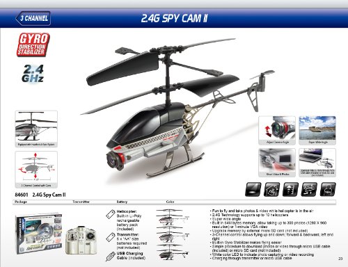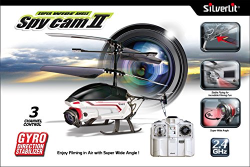 The Silverlit Spy Cam-2 is a 3-channel ready-to-fly 2.4GHz radio control helicopter, suitable for operation indoors or outside;Steer the helicopter by simply moving the transmitter joystick left or right, whilst operating the throttle to take off, hover and land;Incorporates a lightweight lithium polymer battery for long flights, and fast recharging direct from the transmitter;As assortment varies, we are unable to guarentee which colour product or radio control band you will receive;Requires 6 x AA alkaline batteries (not included)Feature