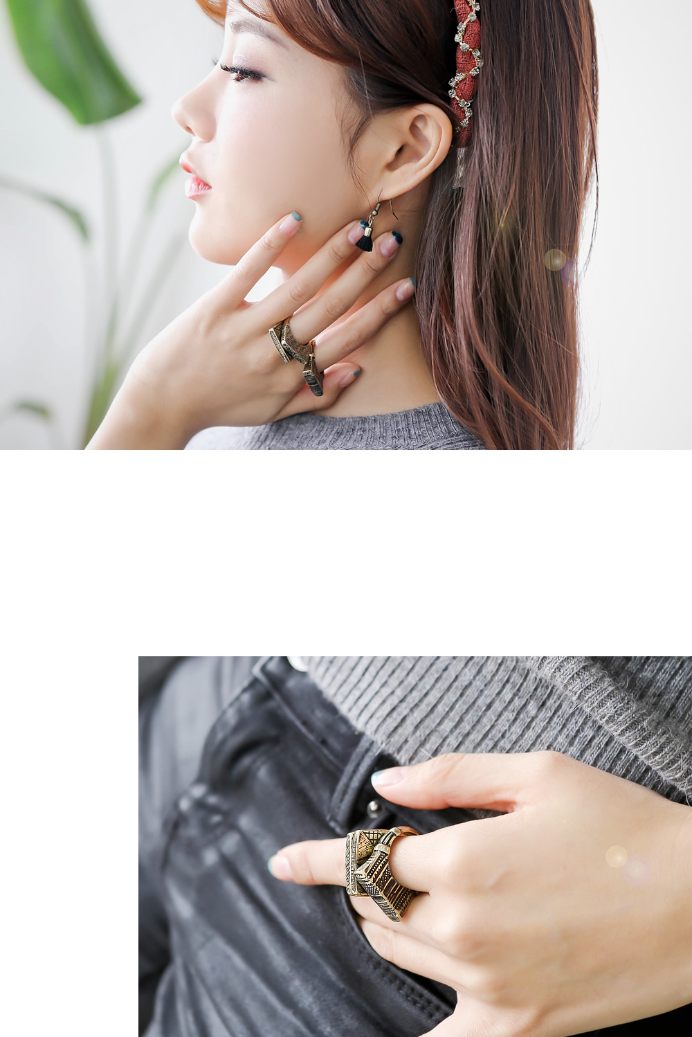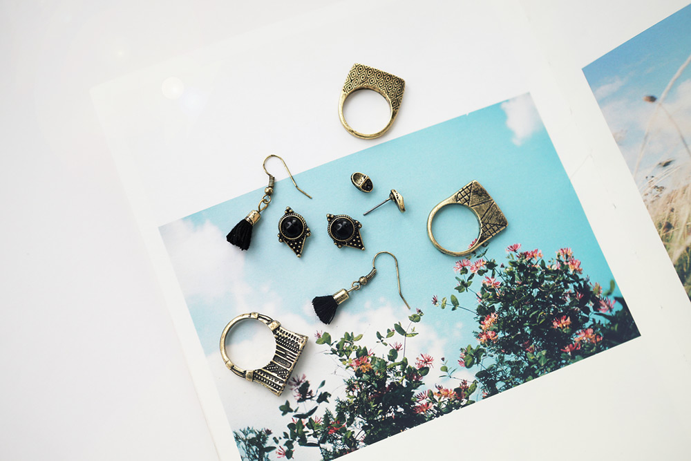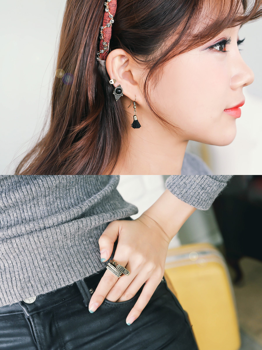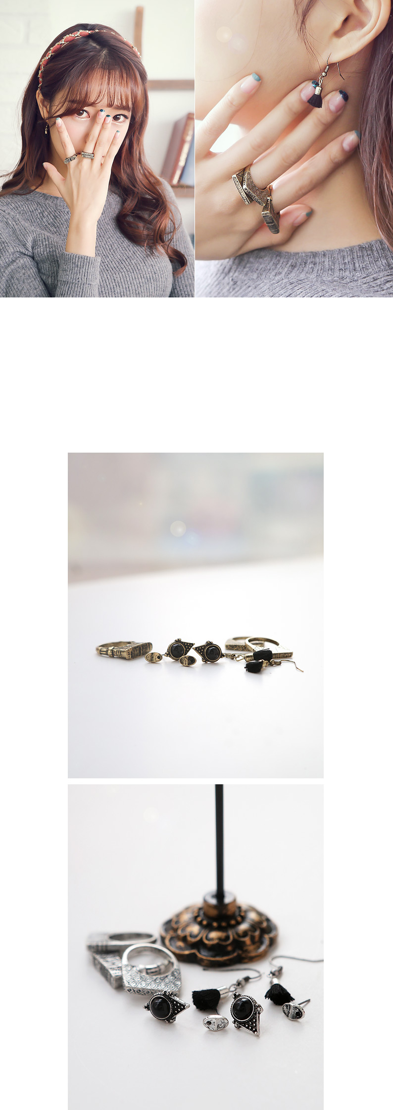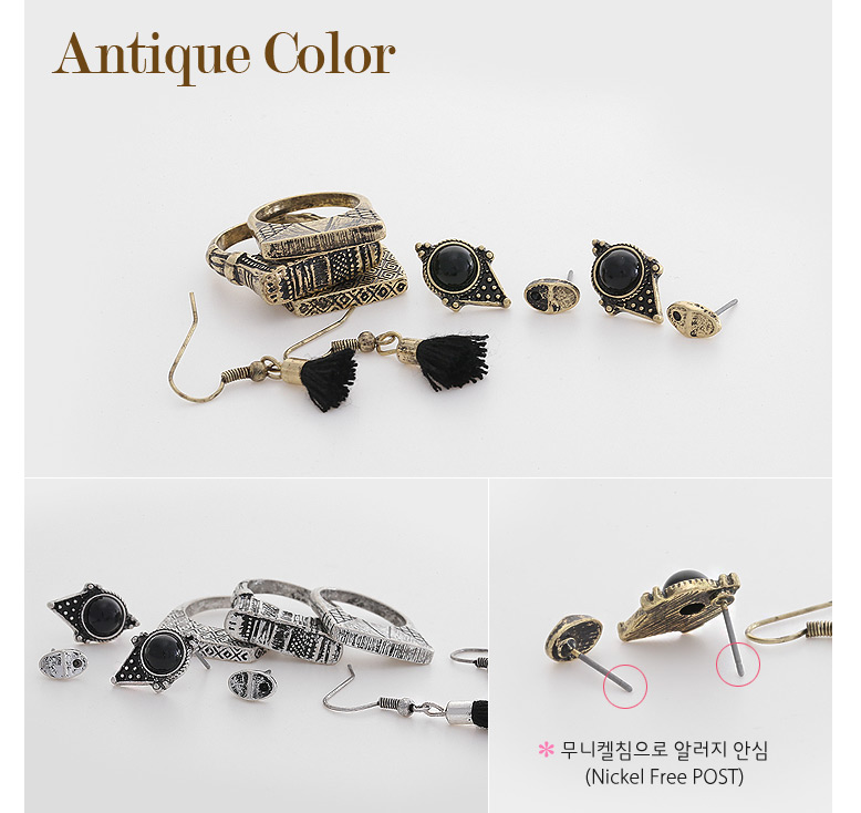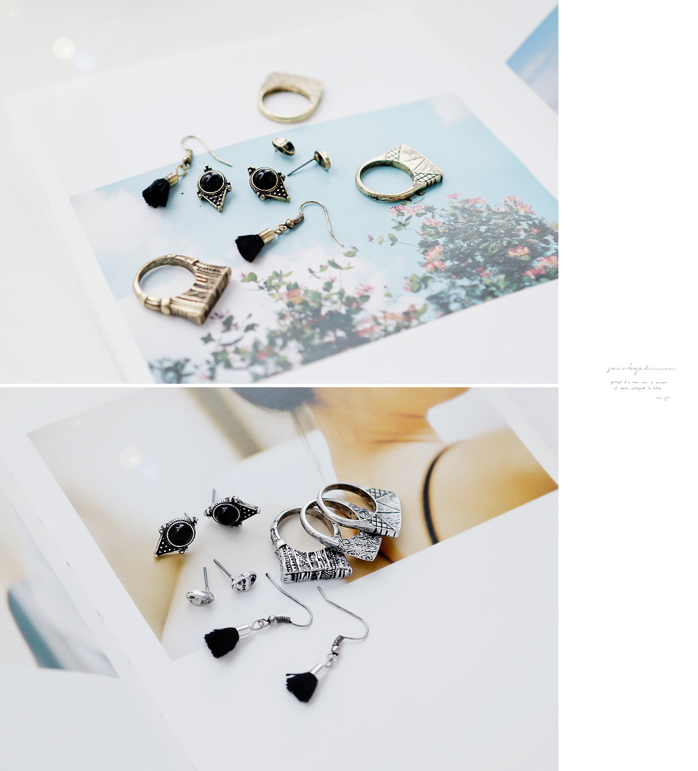 귀걸이 3가지와 반지 3개가 세트로 버라이어티한 구성이 매력적인 제품.