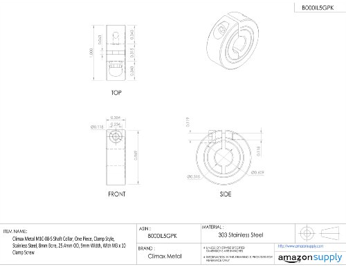 Climax Metal M1C-08-S Shaft Collar, One Piece, Clamp Style, Stainless Steel, 8mm Bore, 25.4mm OD, 9mm Width, With M3 x 10 Clamp Screw