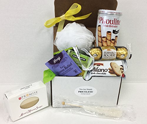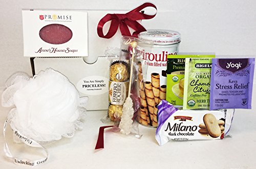Unlocking Greatness helps support children who are victims of human trafficking AND kids with chronic medical conditions. LOOK INSIDE THE BOX: Your loved one will be so encouraged to read "You Are Simply Priceless". Each 8x4x4 cardboard gift basket comes with a beautiful decorative ribbon. Your loved one will receive our custom Unlocking Greatness bath mesh body sponge and a bar of Salvation Army Anne's House Promise Program soaps (made by the kids from the human trafficking program). Scents vary and are randomly chosen: Cucumber Melon, White ginger amber, White Lilac, Energy, Lemongrass or Pomegranate. Additionally, your loved one will receive one 3-pack Ferrero Rocher Hazelnut chocolates, Pepperidge Farm Milano Dark Chocolate Cookies, and a can of Pirouline Chocolate/ Dark Chocolate Hazelnut Wafers. Each gift box also includes: Yogi Stress Relief Tea, Bigelow Premium Green tea/ Bigelow Organic Chamomile Citrus caffeine free tea, and a gourmet sugar swizzle stick/ rock candy. Enjoy! Comes shrink wrapped for your protection. Enjoy!Feature