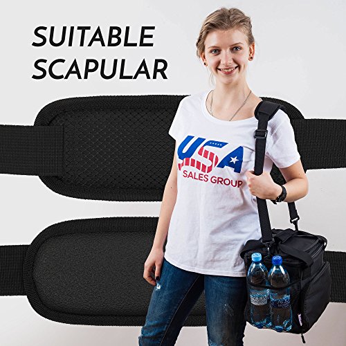 HANDLES AND ADDITIONAL STRAPS. Our insulated lunch bag has a back strap so that you can attach the bag reliably to the front seat of your car (with a seatbelt) or on a travel bag/case. A removable 50 inch long shoulder strap has a non-slip patch which reduces pressure against the shoulder.