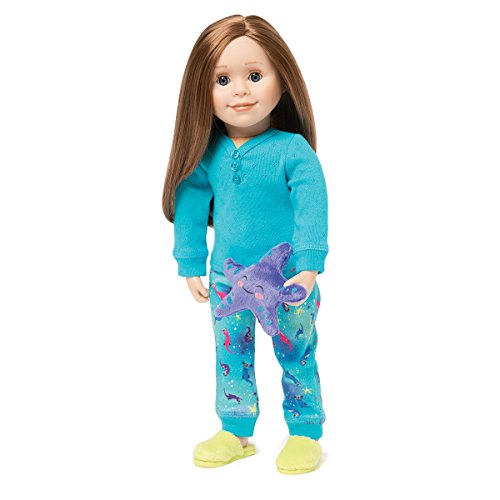 - 3-piece outfit includes blue full-length pajamas, green slippers, and sea star stuffed toy