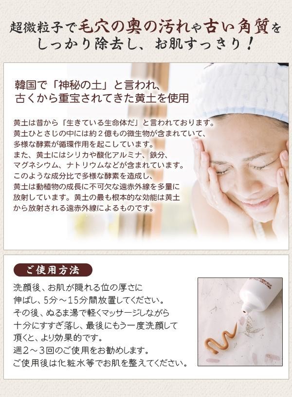 韓国で古くから「神秘の土」と言われ重宝されてきた「黄土」を使用した、洗い流すタイプのクレイパックです。超微粒子で毛穴の奥の汚れや古い角質をしっかり除去し、お肌をスッキリさせます!! |