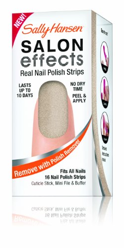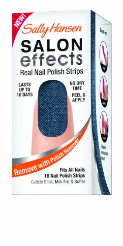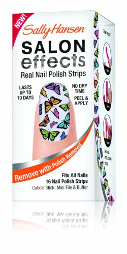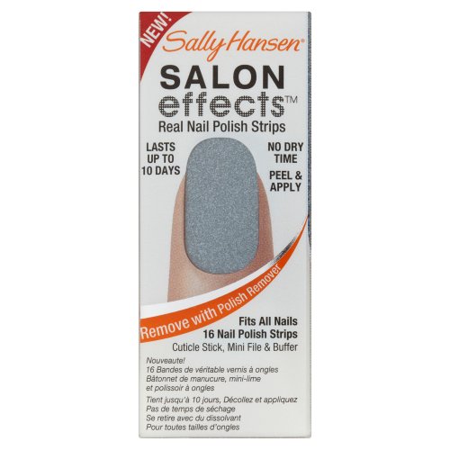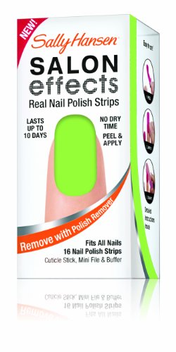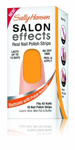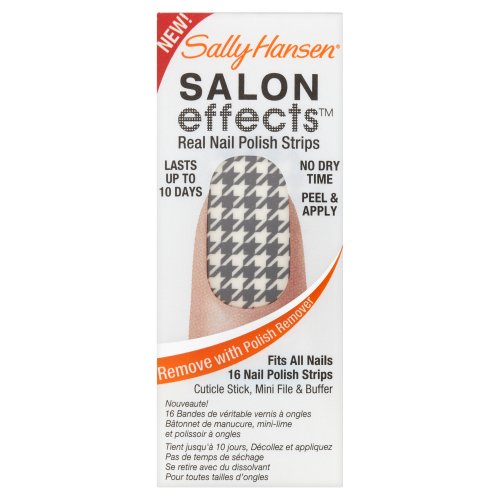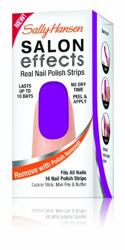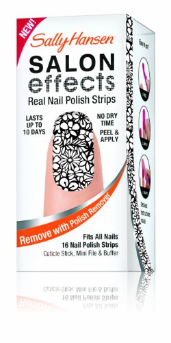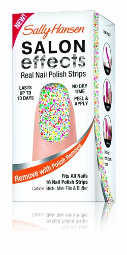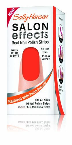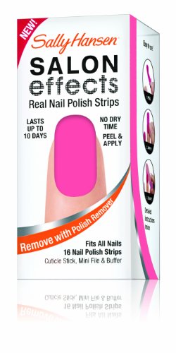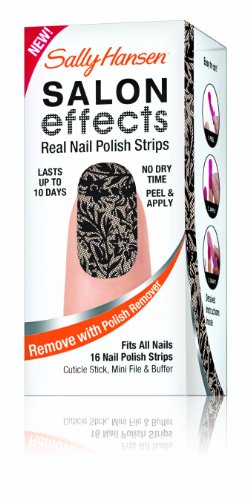 Sally knows nails are the best accessory. Introducing Sally Hansen salon effects, real nail polish strips that gives you a salon fashion manicure anytime, any place. It wears like nail polish because it is nail polish. There is no dry time so you're ready to go. Salon effects lasts up to 10 days and removes easily with nail polish remover. Just peel, apply and file. Accessorize your nails with neons, glitters, and high fashion patterns with salon effects-24 fashion-forward styles to choose from.Feature