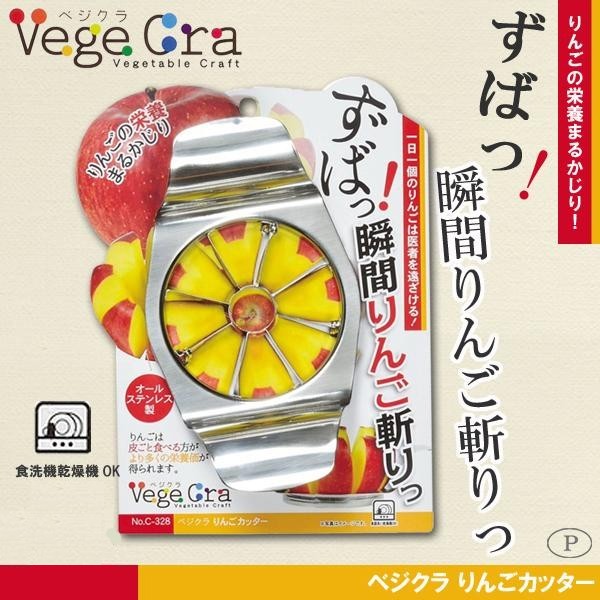| りんごは皮ごと食べる方が栄養価が高いと言われています。このりんごカッターがあれば、りんごの上からカッターをずばっ!!と押し込むだけ。あっという間に食べやすい形になります。 |