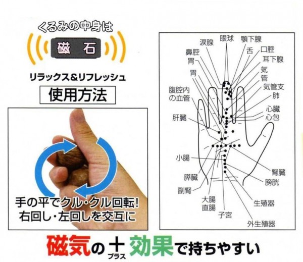 磁気の+効果で持ちやすい。2つのクルミを手の平でクルクル回転、右回し・左回しを交互にすると手のリラックス&リフレッシュになります。手の平のツボを刺激し、指・指先の機能回復運動になります。 |