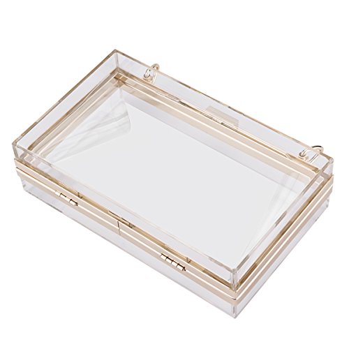 Product Description Beautiful Clear Acrylic Purse and Bag For Every Women Make every appearance memorable with this acrylic box clutch handbag by SharPlus. Compliment your outfits and go for a sophisticated, feminine look that is both classy and attractive. Professional Size Our transparent box clutch bag has professional size as 7" x 4.3" x 1.9" inches and weighs only about 0.88 lbs. Flexible Use This lady vintage perspex bag is transparent and easy to use and has detachable golden keychain shoulder strap can reach 23" in length. High Quality Material Our shell handbag is made of pure acrylic material; with a gel lining and its metallic kiss-lock closure has a golden color. Note that a faint smell are natural and unique to each item and will soon fade with use. Comfortable Hold, Large Capacity Whether you decide to hold it as a clutch purse bag or a cross body bag with its convenient strap, you will have the easiest and most comfortable experience. Its size is enough to fit all your essential items, including a convenient slot for your smartphone. Top Construction Sharplus box clutch handbags are designed with a hard shell body that allows for convenient placement on any flat surface and an unconventional box shape, our bag is unique, durable and convenient apart from an elegant accessory for your appearances. Fashionable Choice for All Occasions This clutch handbag can be used in many ways either hold it, or carry it, and with its classy retro design, you will be able to complete your look for any happy event, including weddings, cocktail parties and brunches. 0