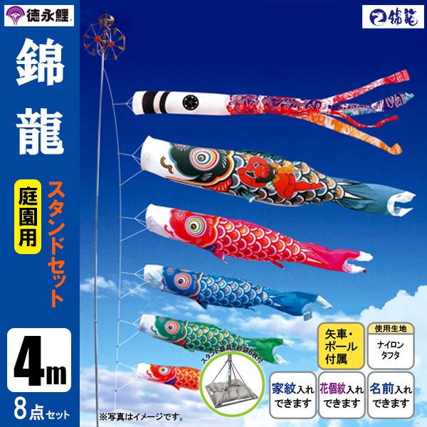 | 錦龍鯉 庭園用大型鯉のぼり スタンド砂袋式ポール付セット | 1.5m鯉3匹 | 2m鯉3匹 | 3m鯉3匹 3m鯉4匹 3m鯉5匹 | 4m鯉3匹 4m鯉4匹 4m鯉5匹 |