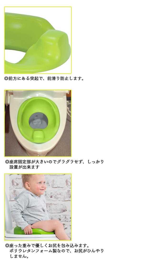 | 洋式トイレ(大人用)に置いて使用する、お子様用トイレトレーニング便座です。深い座席は座ることでより沈み、座面がお尻に沿うようになります。またポリウレタンフォーム製で、お尻がひんやりしません。つなぎ目や隙間などの細かいパーツがないのでさっと汚れも拭き取れお手入れ簡単♪前滑り防止ストッパーが付いています。 |