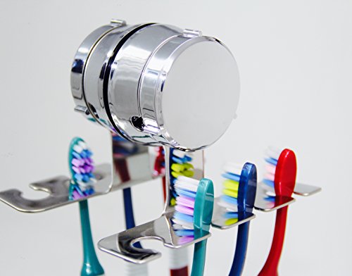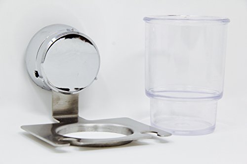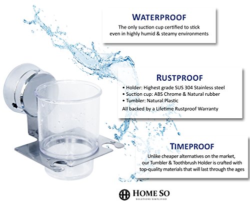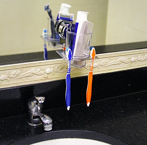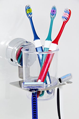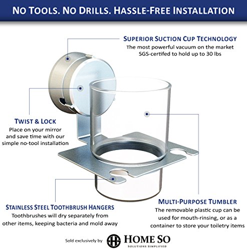 HOME SO Toothbrush & Razor Holder with Suction Cup Hanger - Plastic Glass Tumbler for Rinsing or Storage for Toiletry, Toothpaste, Shaver, Comb - Stick on Bathroom Mirror - Rustproof Stainless Steel