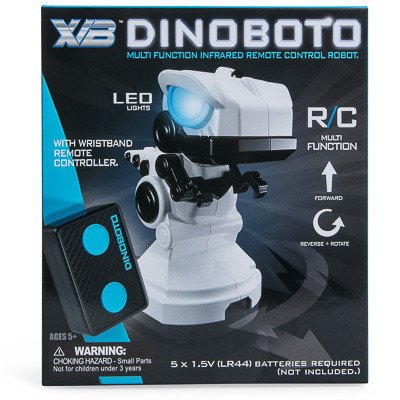 omg! it's your very own dinosaur robot! this lil guy is remote controlled & multi function! multi function infrared & remote control! the robot moves forward, reverse and rotates! LED eyes light up! the remote control is a wristband! requires (5) 1.5V (LR44) batteries (not included) colors:white and black brand: xibTM ages: 5+