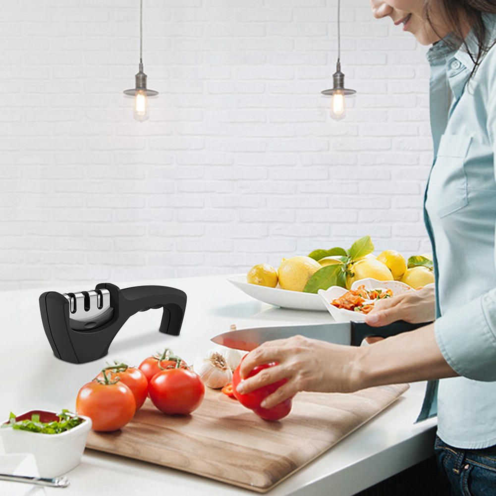 1) Place the knife sharpener on a flat place, grasp the handle with one hand and grab the knife with another hand.