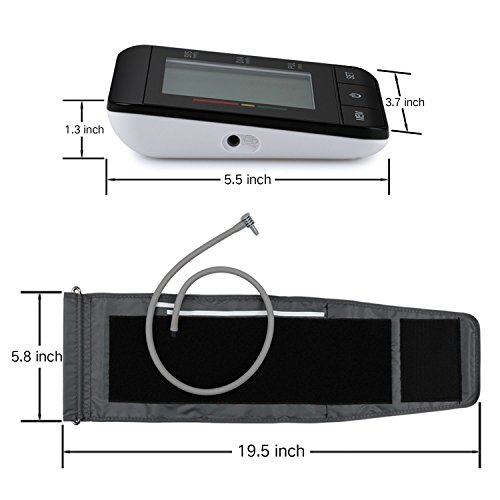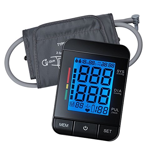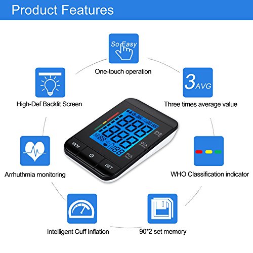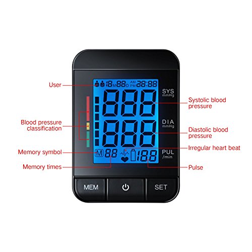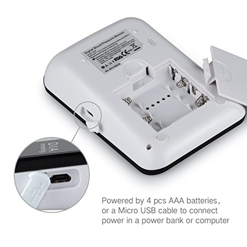 -. Feature : Intelligent and Accurate: The Upper Arm BP Monitor detects your blood's movement through your brachial artery and converts the movement into digital reading intelligently. CE0123 certification and FDA/UDI approved, no technique required, and show you accurate measurements / Large Backlit Screen: The unique blue kit background large screen helps you read the measurements, date and time clearly, even in dark rooms. No stethoscope needed, one person can operate it alone. The BP Monitor is an ideal item for daily health monitoring / 2×90 Sets Memory: Two users can store their last 90 readings each for last viewing automatically, totally 180 readings. Historical measurements help you record and track blood pressure changes / Measuring fast and IHB indicator: One key operation, the BP Monitor intelligently measures systolic pressure, diastolic blood pressure, pulse within seconds, and alerts you if the irregular heartbeat is detected during measurement. With wide cuff range(upper-arm circumference 22-32cm), can fit more arms / Portable and convenient: It's L5.4inch x W3.7inch x H1.3inch for easy carrying and requires 4pcs AAA batteries, or a Micro USB cable to connect power in a power bank or computer for power supply (Batteries and USB cable are not included in the package). You can measure your blood pressure at anytime and anywhere