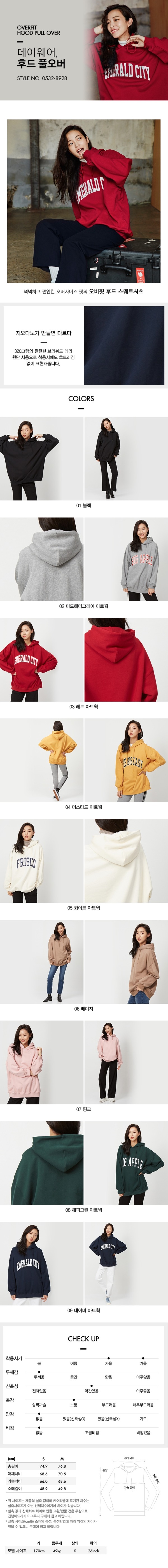 넉넉하고 편안한 오버 사이즈의 핏의 오버핏 후드 스웨트 셔츠 입니다.사이즈가 많이 여유롭게 나온 사이즈로 55,66 입는 분들도 S 사이즈 착용하셔도 여유롭습니다.