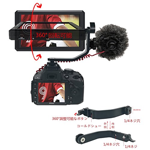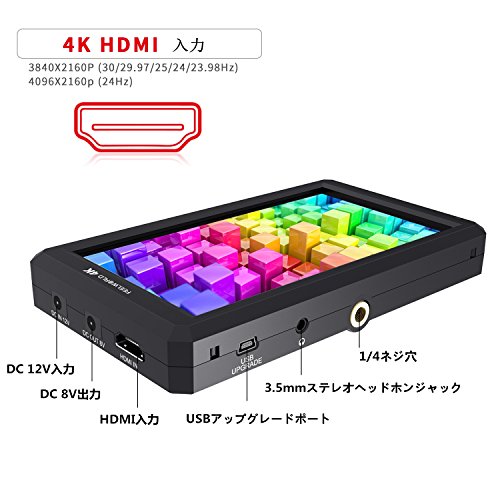 -. Feature : 【5.7インチIPSスクリーン】1920X1080の解像度。16.7M(8bit)カラーディスプレイは、386PPIの性能、400:1のコントラスト、450cd / m2の明るさのシャープな画像を提供し、色彩還元性が優れます / 【4K信号をサポート】 4K HDMI信号入力可能、 4K UHD 3840×2160p(30 / 29.97 / 25/24 / 23.98Hz)、DCI 4K 4096×2160p(24Hz)対応 / 【プロな補助機能】ピーキングフォーカスアシスト、ヒストグラム、ゼブラ露光、カメラモード、イメージフリップ、チェックフィールド、アナモルフィックモード(1.3x、2.0x、2.0x mag)、セーフエリア(80%,85%,90%,93%,96%)、ピクセルからピクセル、イメージフリップ(H、V、H / V)、色温度調整など / 【インストール方法】3つの標準1/4ネジ穴のおかけで、DSLRリング、カムコーダーキット、ハンドヘルドスタビライザー、ビデオカメラクレーンなどの撮影アクセサリが取り付け可能です。また、 特別にデザインされたチルトアームを付属して、簡単にはねじれと、モニターと組み合わせて360度が回転でき、様々な撮影角度を調整します / 【DC-8V電源出力サポート】内蔵DC-8V電源出力は、モニターからの電力をカメラのLEDライトや他のスタッフの照明点灯し、モニターからの電力を引き出すことができます。作業時間を延長して、出かける場合ではおすすめます。ダミーバッテリー アダプターリンク:B078P8VXLN(キヤノンシリーズ);B078P44VD2(パナソニックシリーズ);B078PBMN7P(ソニーA6シリーズ);B078P9PGQZ(ソニーA7シリーズ)