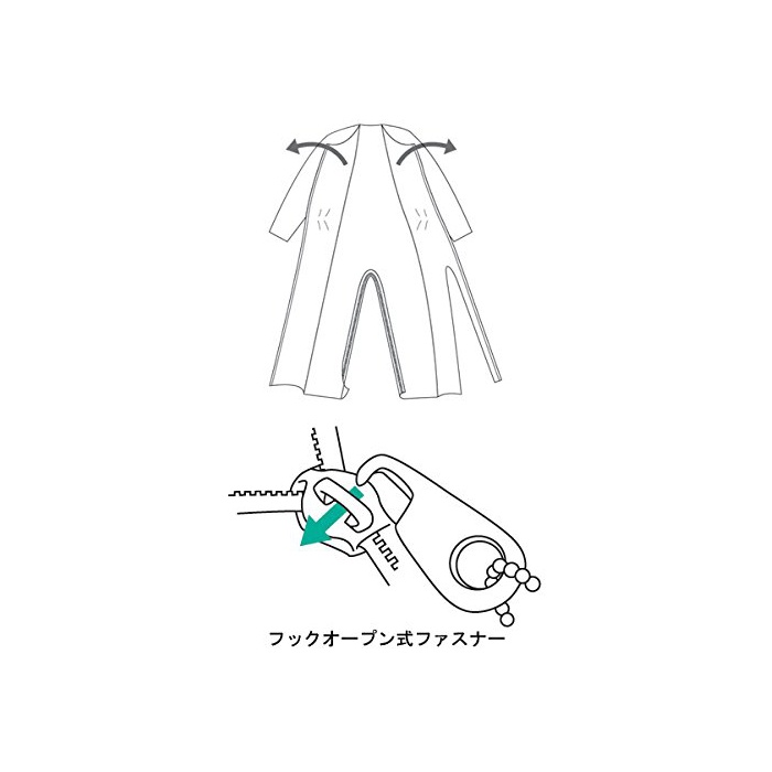 가슴 팍부터 발목까지 1책의 패스너에 개폐 이 생기는 풀 오픈 타입.제균가공 폴리에스텔 사용.